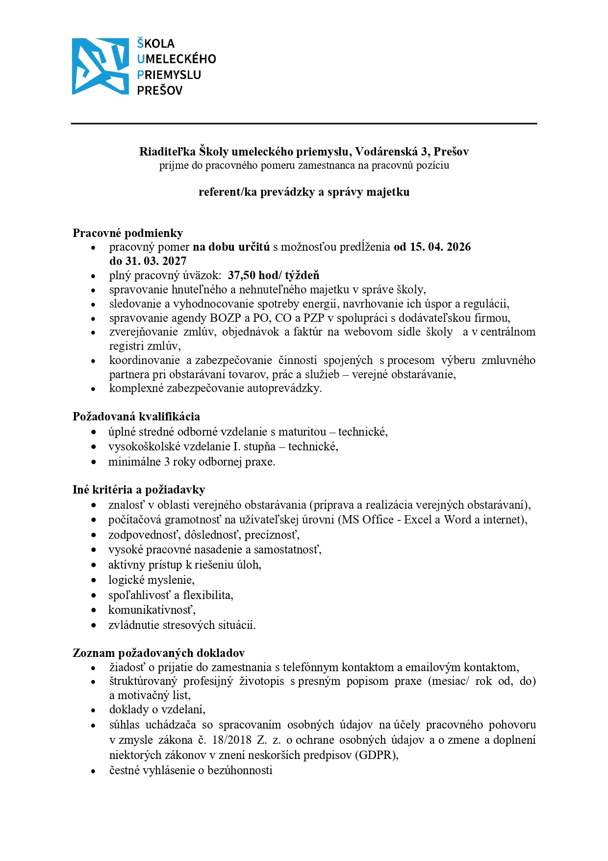 Referent/ka prevádzky a správy majetku